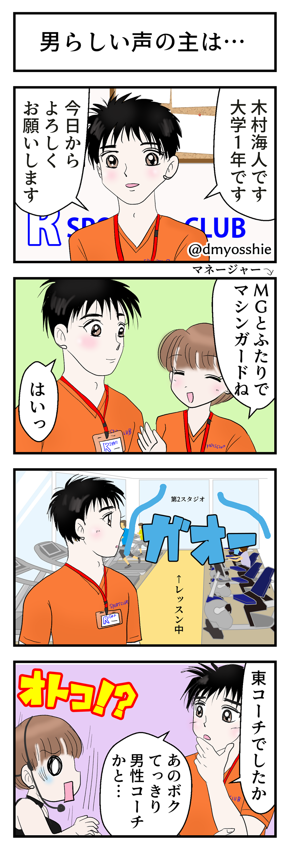 私がスタジオレッスンをした後で新人の男の子(フロントにいた)がびっくりしたことがありました。例によってこの漫画も全部実話なわけですが、さすがにオトコと間違われたのはショックでした(笑)