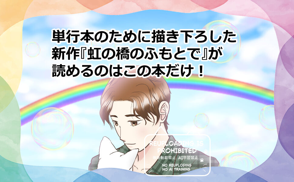 「虹の橋のふもとで」…どこにも公開したことがない、この短編集のために描き下ろした作品です。赤ちゃんの頃から兄弟のように仲良く育ってきた男の子と猫。しかし男の子が成長して大学に進学する時、猫は年老いて命が尽きようとしていた。