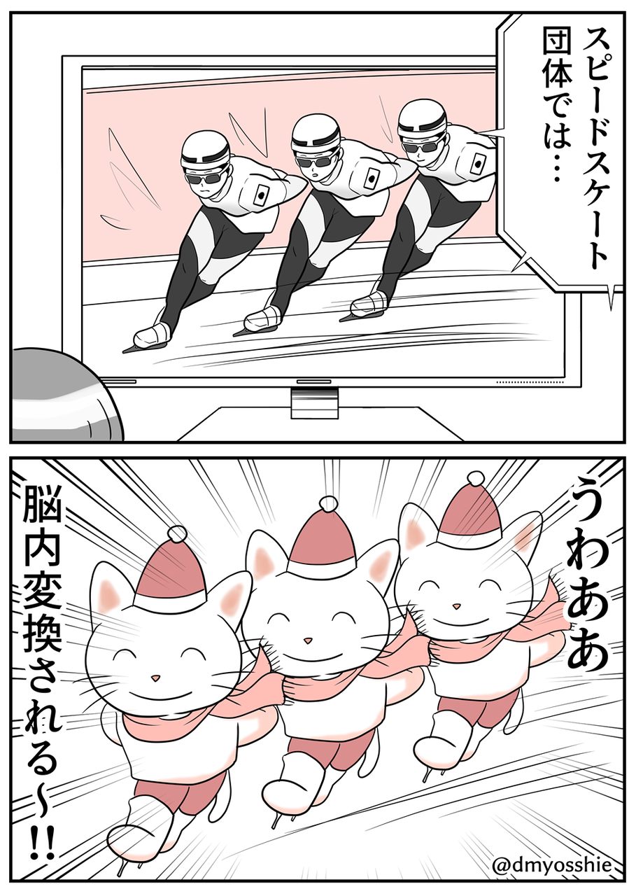 申し訳ないのですが、どういうわけか私はスピードスケート団体の滑る映像を観るたびこんな風に脳内変換されてしまいます💦